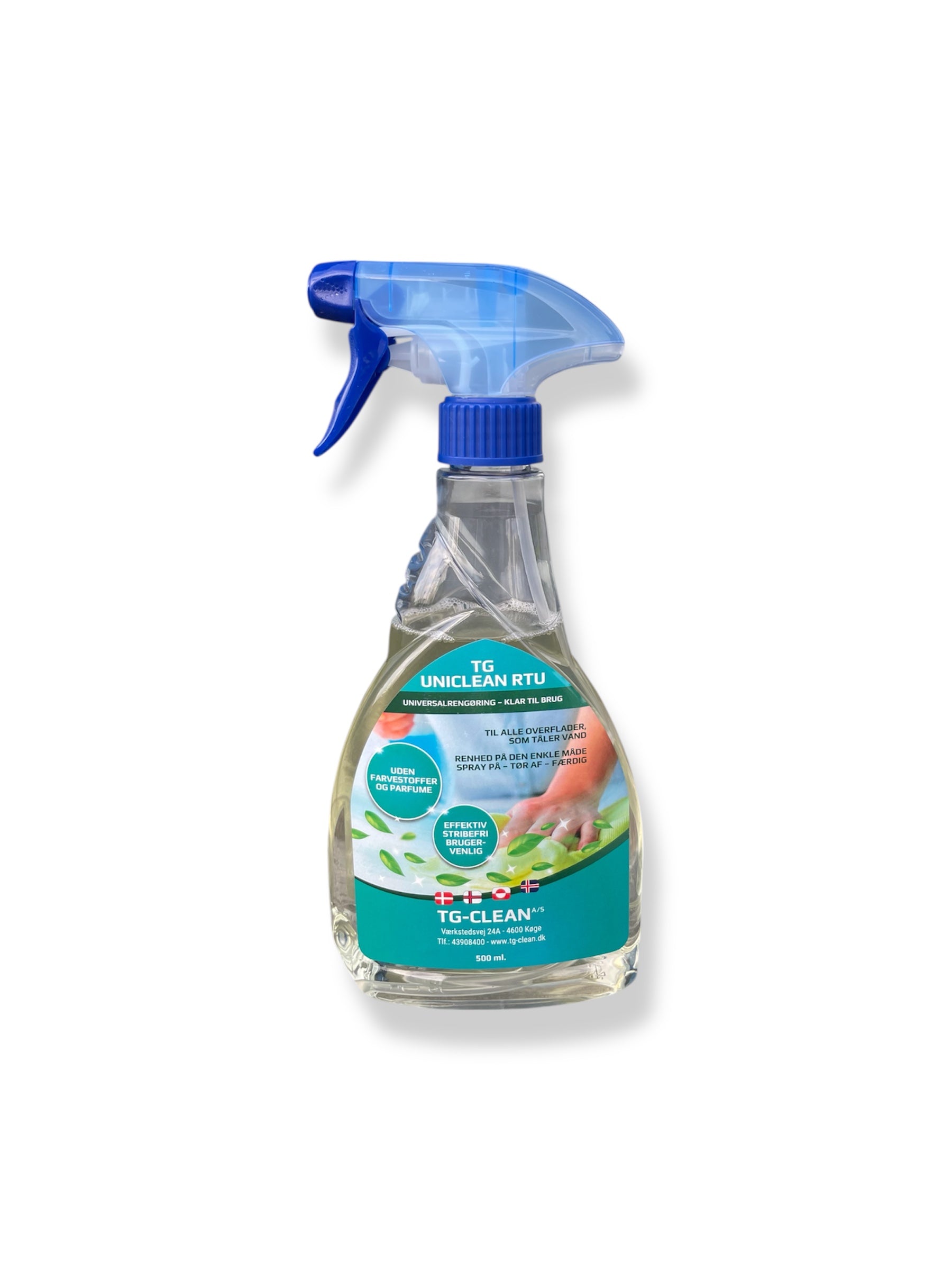 TG UNICLEAN RTU gør rengøring let, effektiv og behagelig. Den klar-til-brug formel sikrer hurtige resultater – spray på, tør af, og du er færdig. Ingen besvær, ingen striber, kun et rent og friskt resultat hver gang.